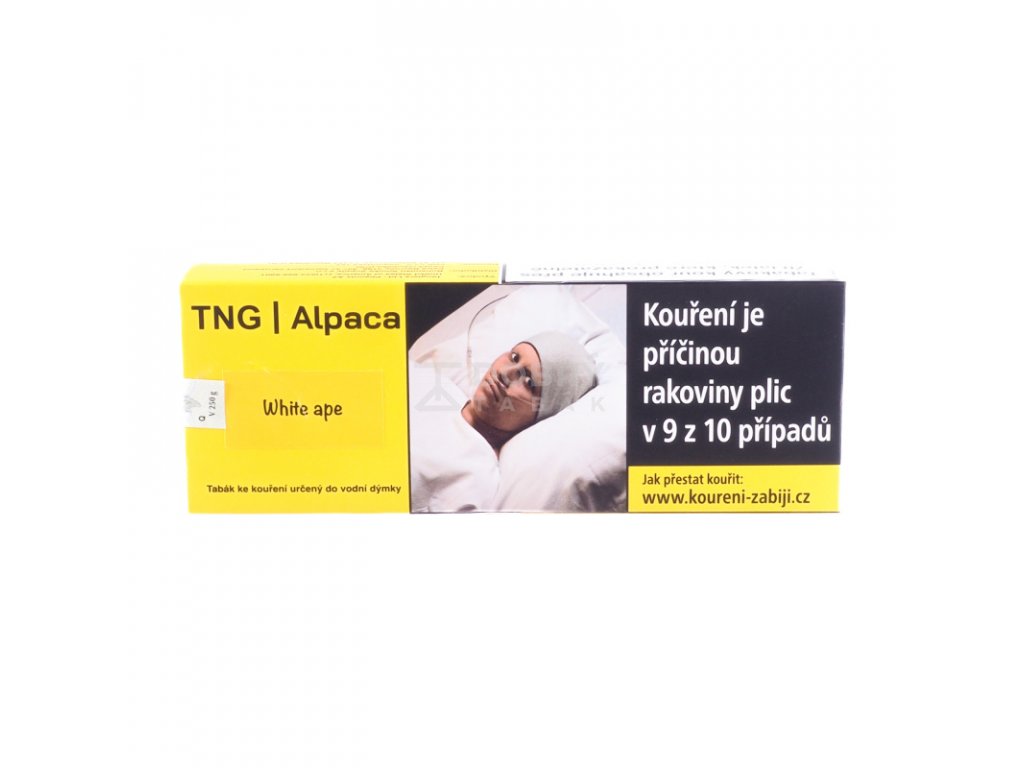 Tabák do vodní dýmky TNG Alpaca White Ape s příchutí bílého hroznu. Verze v menším balení 100 g. Jedná se o prémiový silný tmavý tabák výrazné chuti. Tabák je vyráběn známou společností Tangiers, jejíž tabáky se na českém trhu prodávají pod obchodním názvem TNG Alpaca. Veškeré tabáky americké společnosti Tangiers jsou vyráběny ručně ve městě Phoenix v Arizoně a to již od roku 2000.